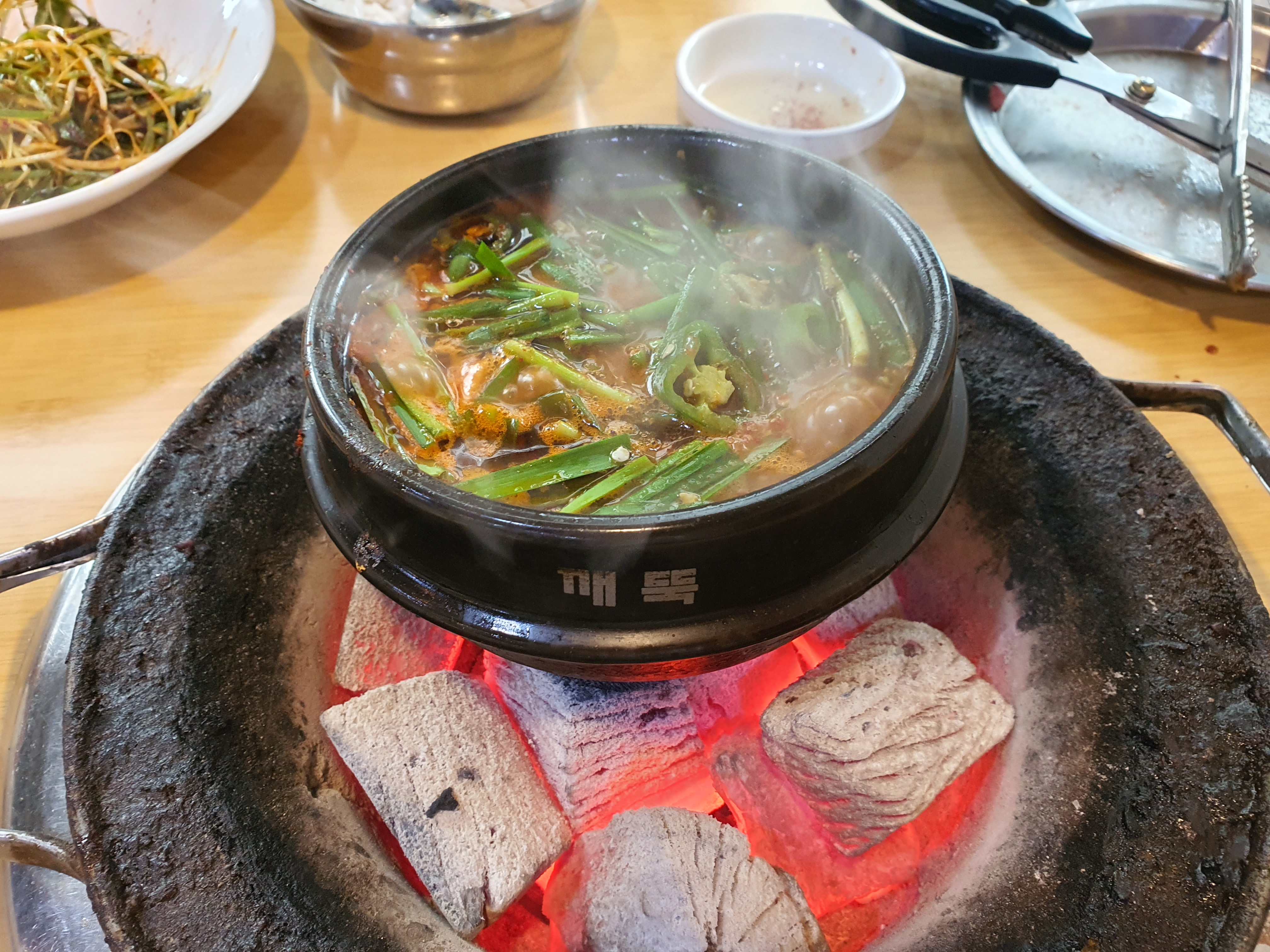 특별히 숯불에 올려진 된장찌개로 점심을 먹었지. 소고기와도 매우 잘 어울렸어.
